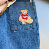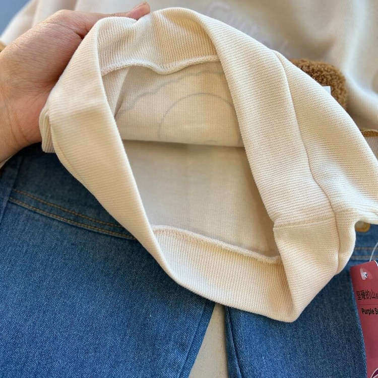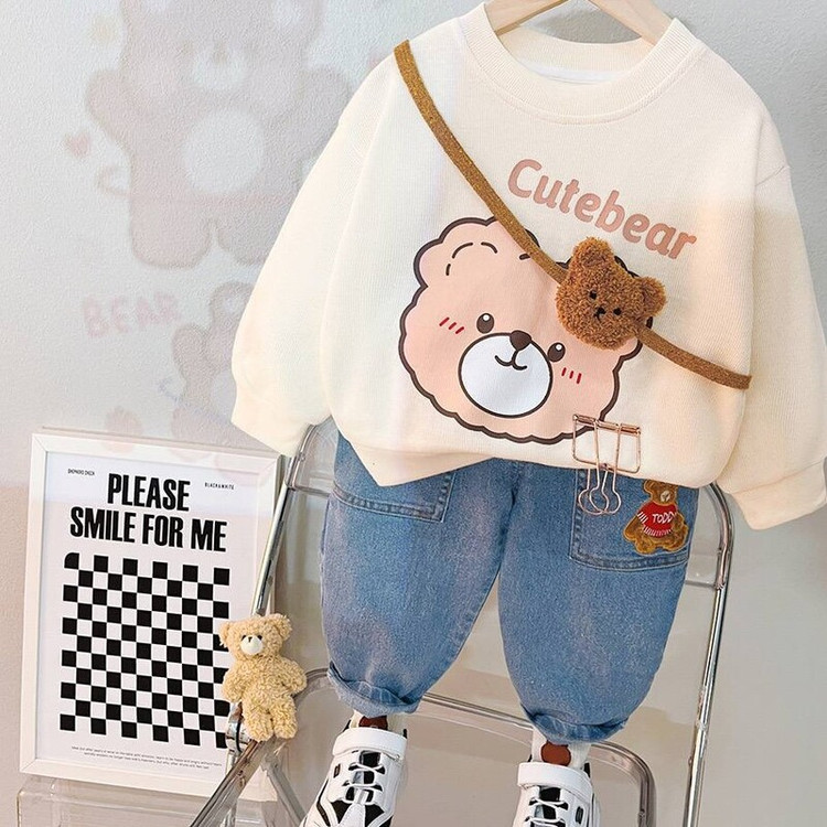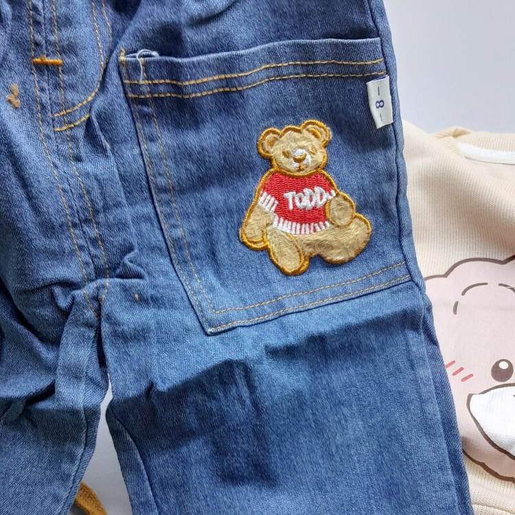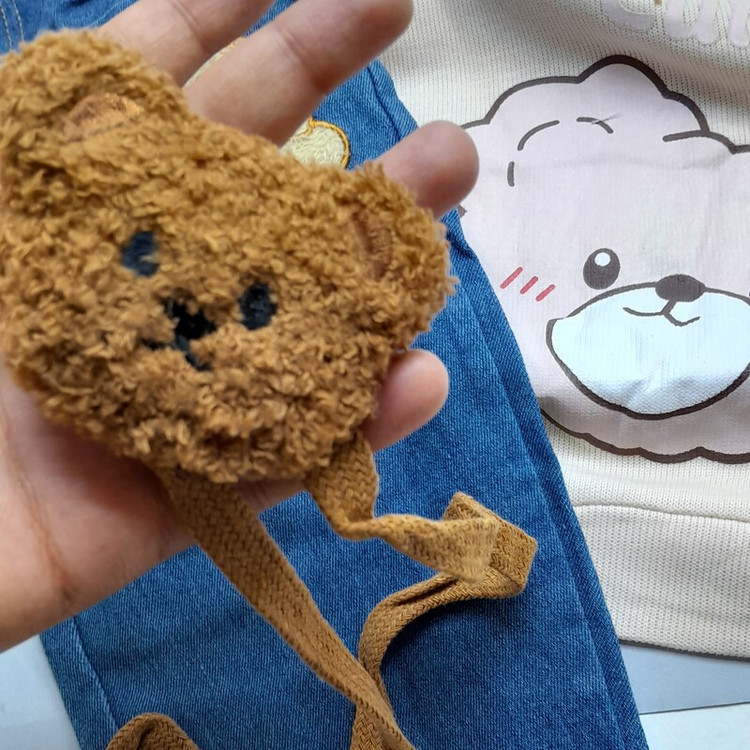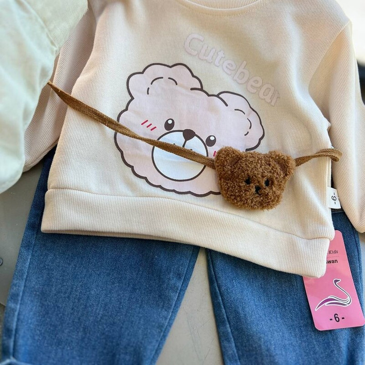 ست دو تیکه همراه کیف عروسکی وارداتی ست لباس عیدبچگانه مناسب دختر و پسر بلوز حالت بافت کبریتی نرم شلوار جین روی شلوار تیکه دوزی خرسی داره