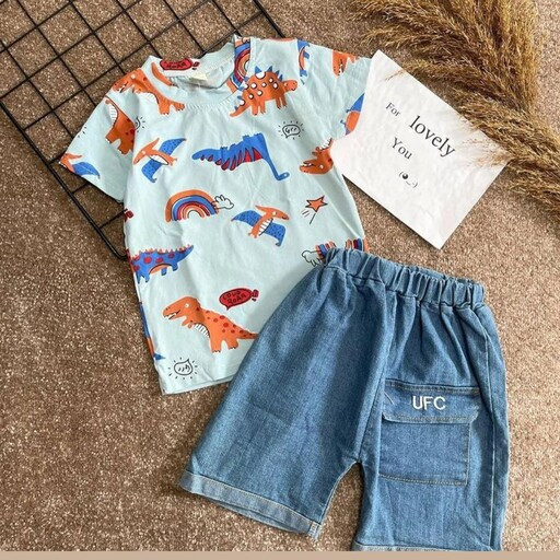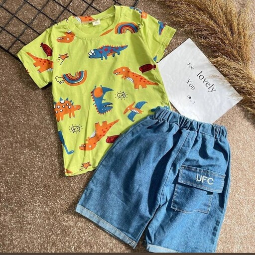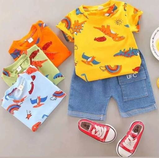 لباس بچگانه ست تیشرت شلوارک وارداتی طرح دایناسور رنگینکمان