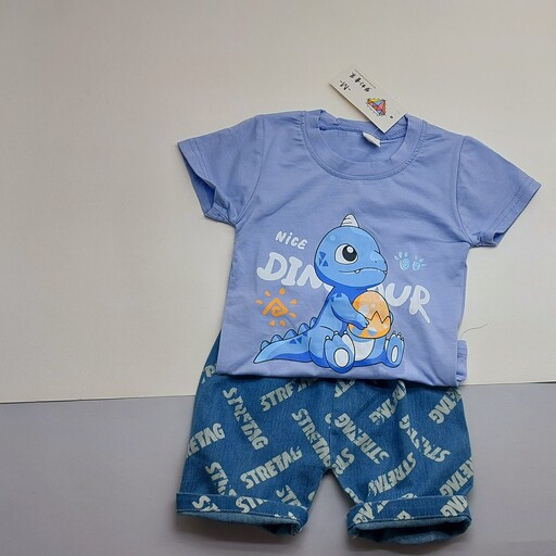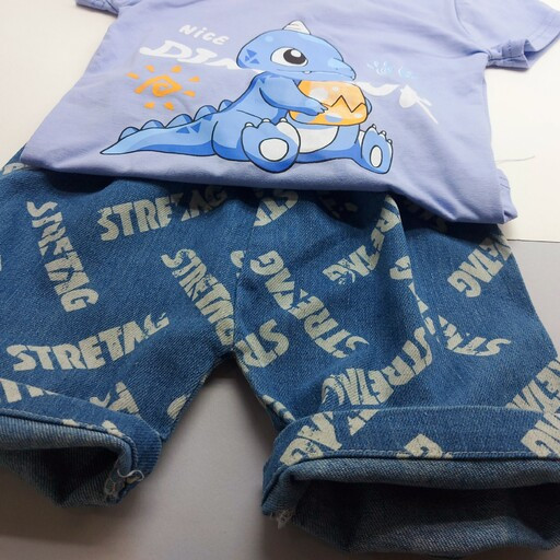 ست تیشرت و شلوارک دایناسوری وارداتی جنس تیشرت نخ پنبه کشی شلوارک جین اورجینال کیفیت چاپ عالی و تضمینی 4 سایز